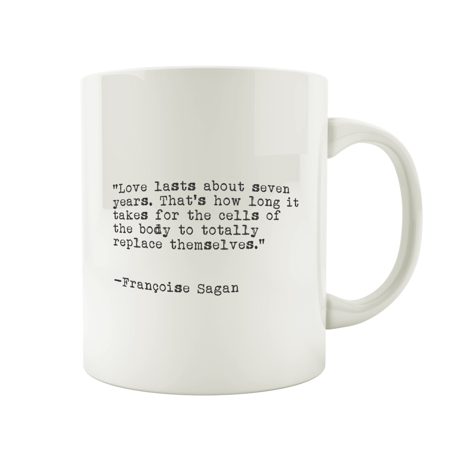 Porslinsmugg med citat av Francoise Sagan "Love lasts about seven years. That's how long it takes for the cells of the body to totally replace themselves.""