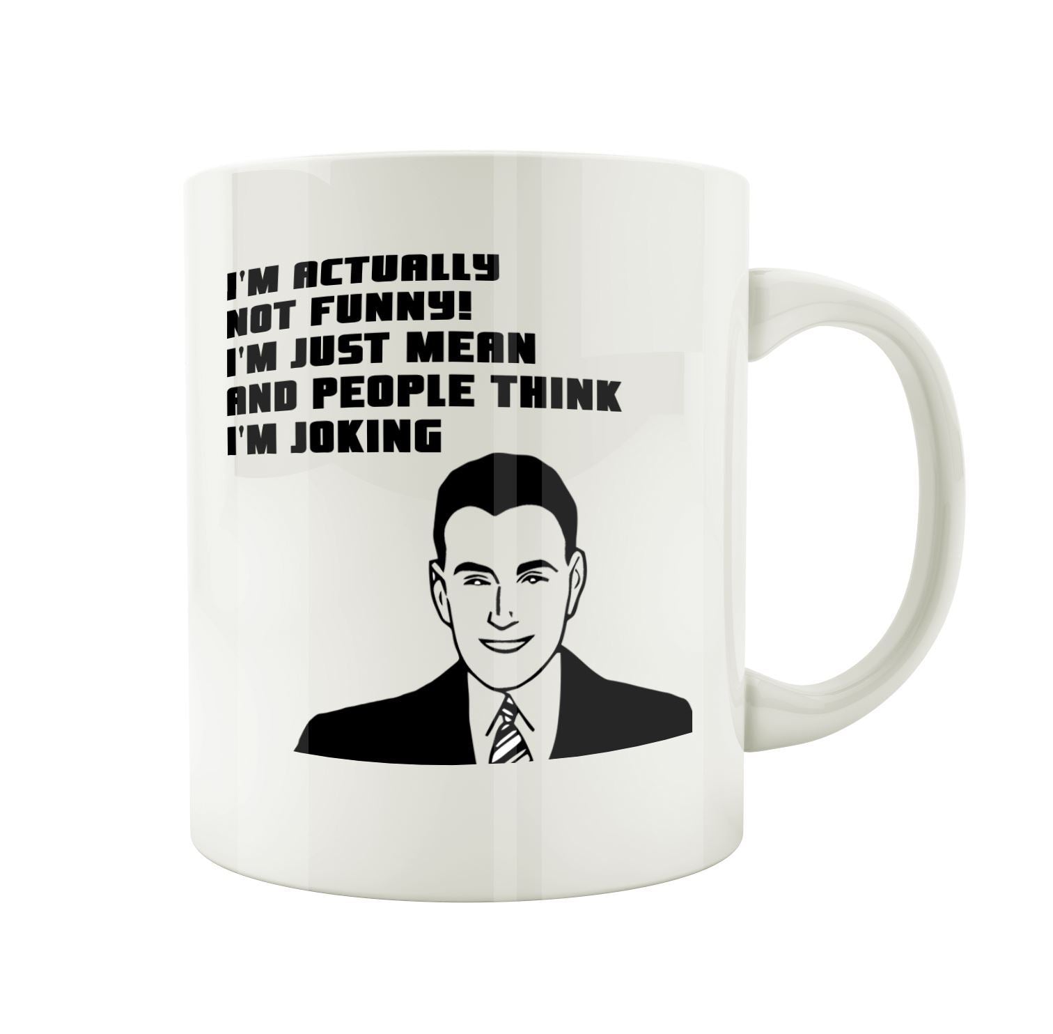 Porslinsmugg med man och texten "Im actually not funny, im just mean and people think im joking"