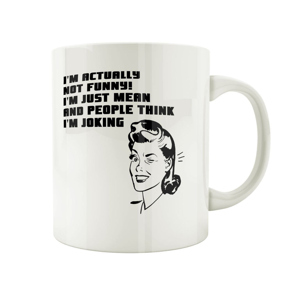 Porslinsmugg med kvinna och texten "Im actually not funny, im just mean and people think im joking"
