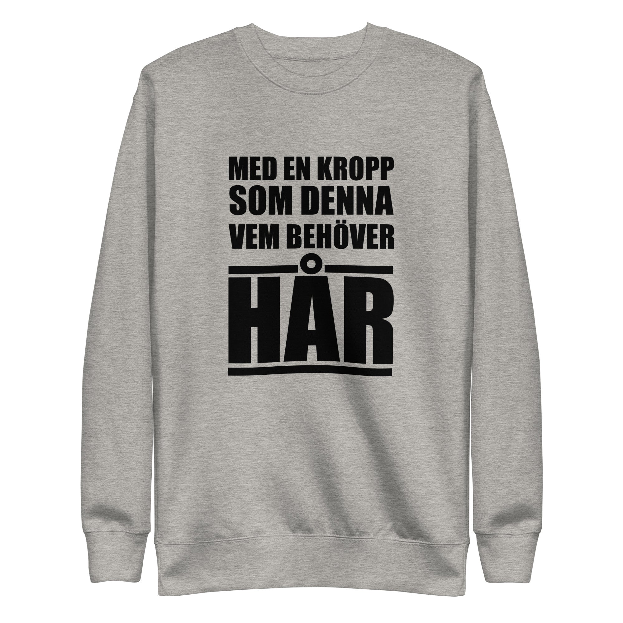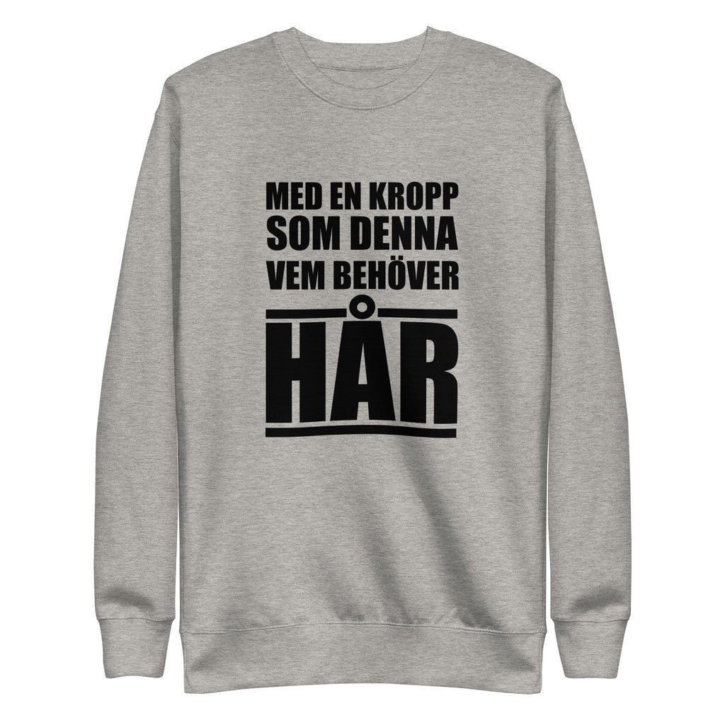 Sweatshirt med texten "Med en kropp som denna vem behöver hår"